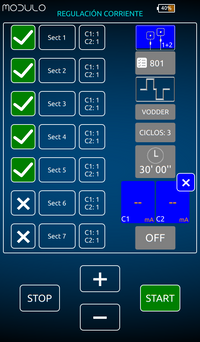 MODULO PLUS Versión PRO, dispone de cuatro canales de estimulación completamente independientes y aislados eléctricamente entre si. La estimulación está controlada tanto a nivel de la corriente constante (CC), como respecto a voltaje constante (CV). Cada protocolo puede estar constituido por una secuencia de hasta 4 fases y en cada una de ellas se puede utilizar un tipo de onda diferente.