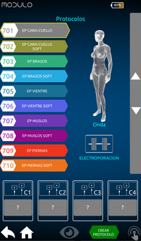Seleccionando la modalidad de electroestimulación, MODULO PLUS Versión PRO cuenta con 4 canales completamente independientes y aislados eléctricamente entre ellos, para una acción de reafirmación, tonificación, electrolipólisis, capilarización y tratamiento de la paniculitis.