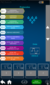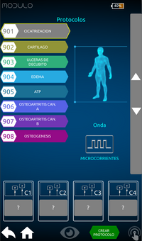 La interfaz de MODULO PLUS versión PRO proporciona la visualización de los parámetros sobre una amplia pantalla táctil en color de 7’’ que permite la lectura incluso a distancia y ofrece al operador la posibilidad de seleccionar, modificar y controlar las funciones y los parámetros de funcionamiento. Una característica única de MODULO PLUS Versión PRO es el Wizard, una guía digital para el empleo paso a paso del aparato. Gracias a un software intuitivo, el Wizard guía al operador en la selección de protocolos terapéuticos preestablecidos.